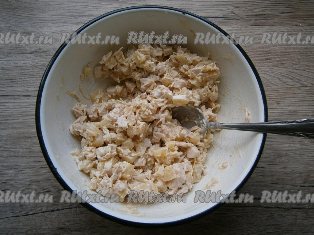 Сыр натереть на средней терке и добавить его в салат из курицы, ананасов и картошки.