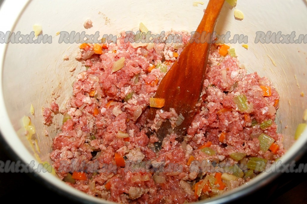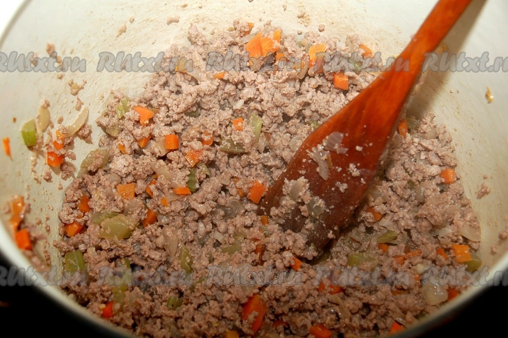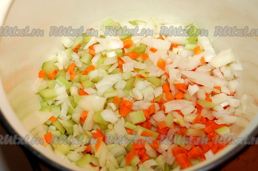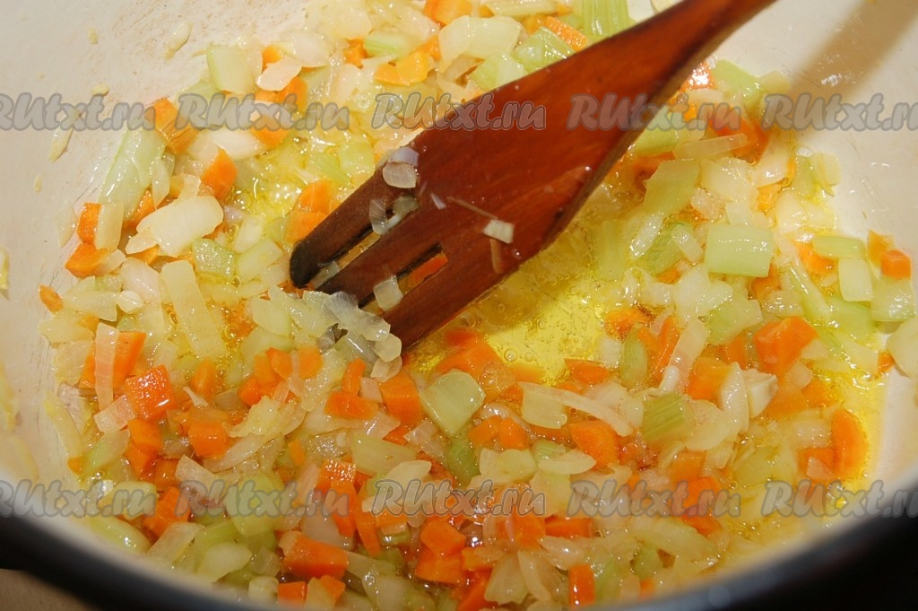 В кастрюлю влить оливковое масло и обжарить в нем нарезанные лук, морковь, сельдерей, очищенный и мелко нарезанный чеснок.
