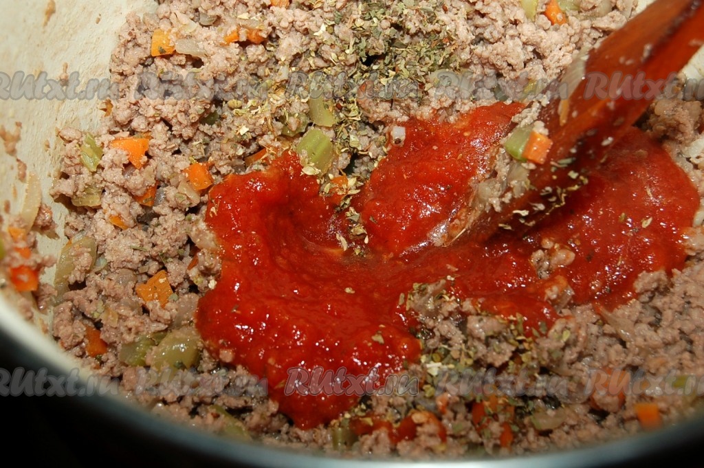 Добавить томатное пюре, орегано, базилик. Тушить 5 минут, не забывать помешивать!