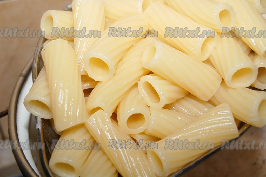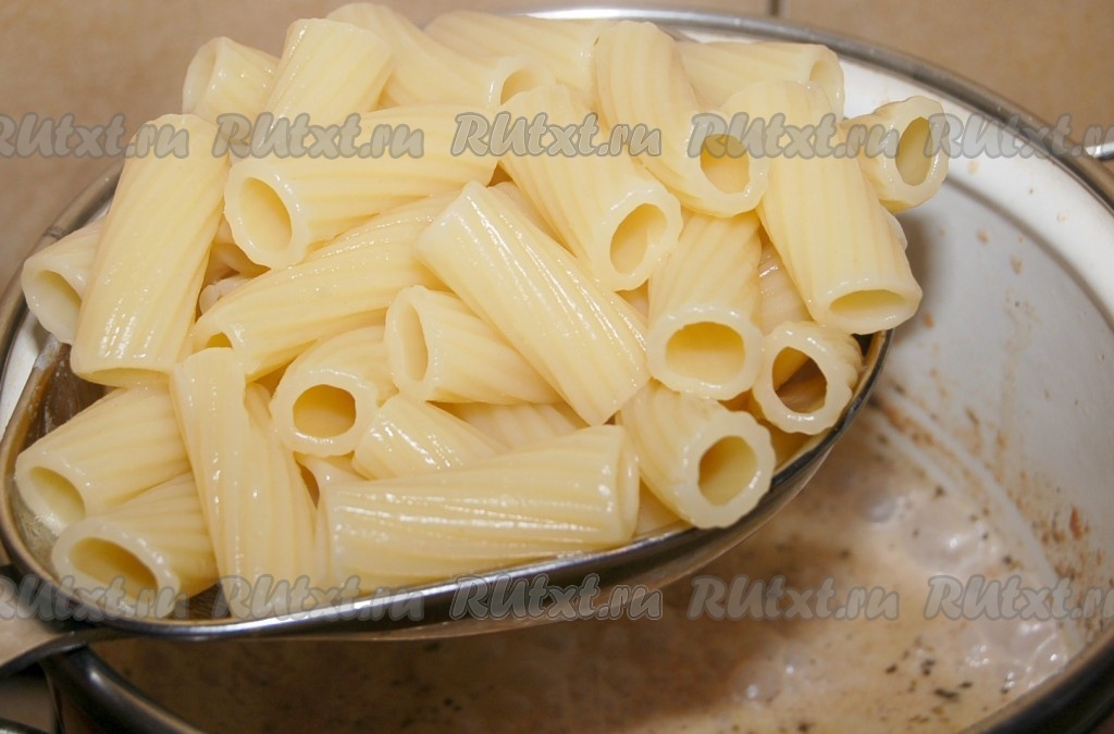 Отварить пасту, согласно инструкции на упаковке. Готовую пасту откинуть на сито, чтобы стекла лишняя вода.