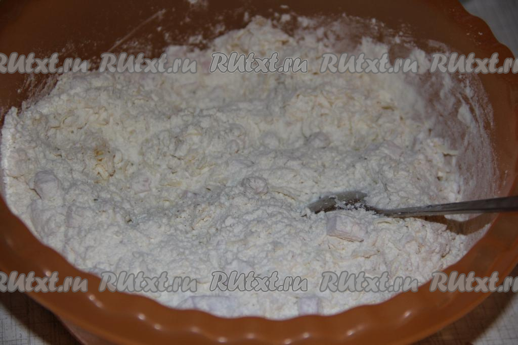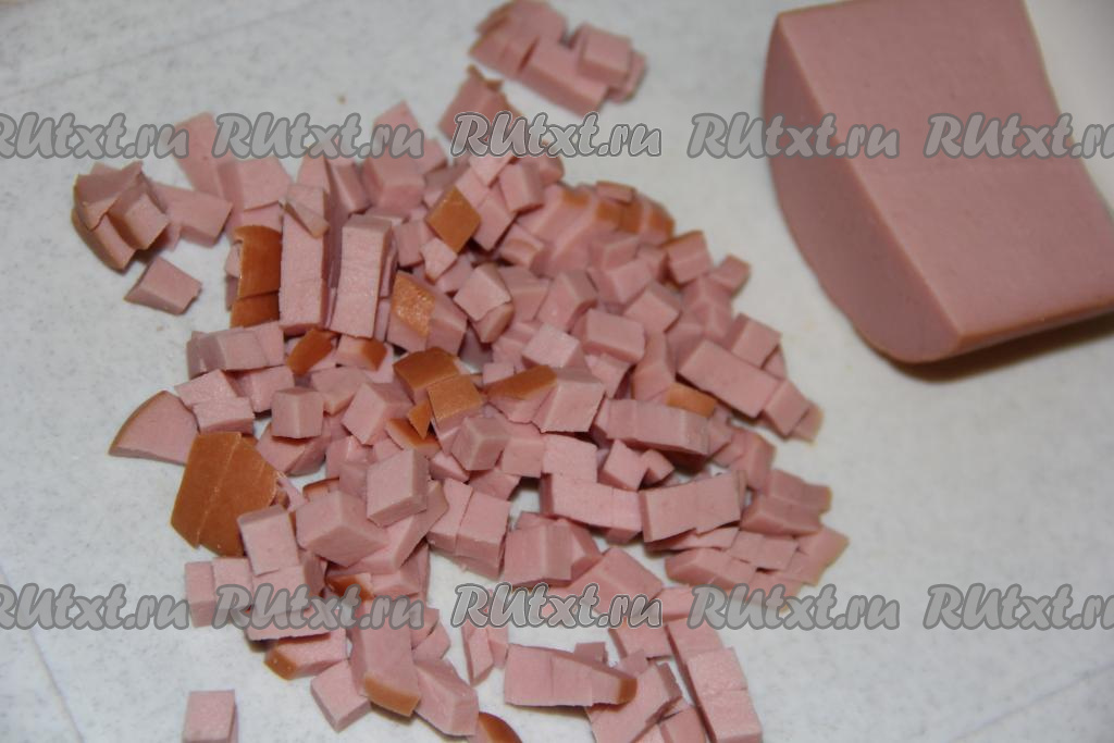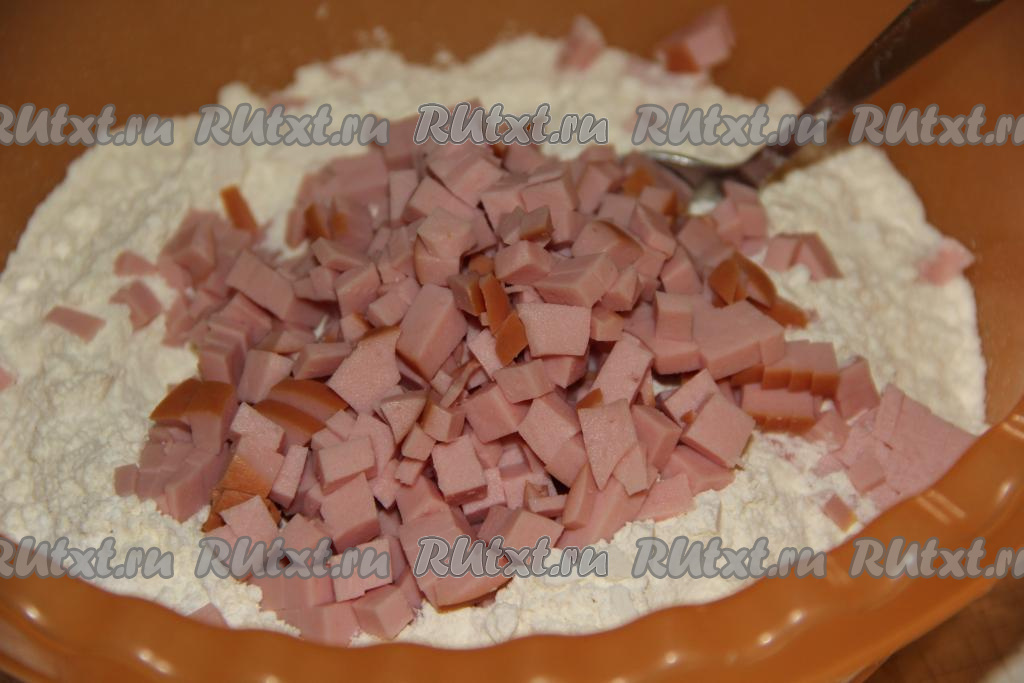 Муку насыпать в глубокую миску, добавить нарезанную колбасу.