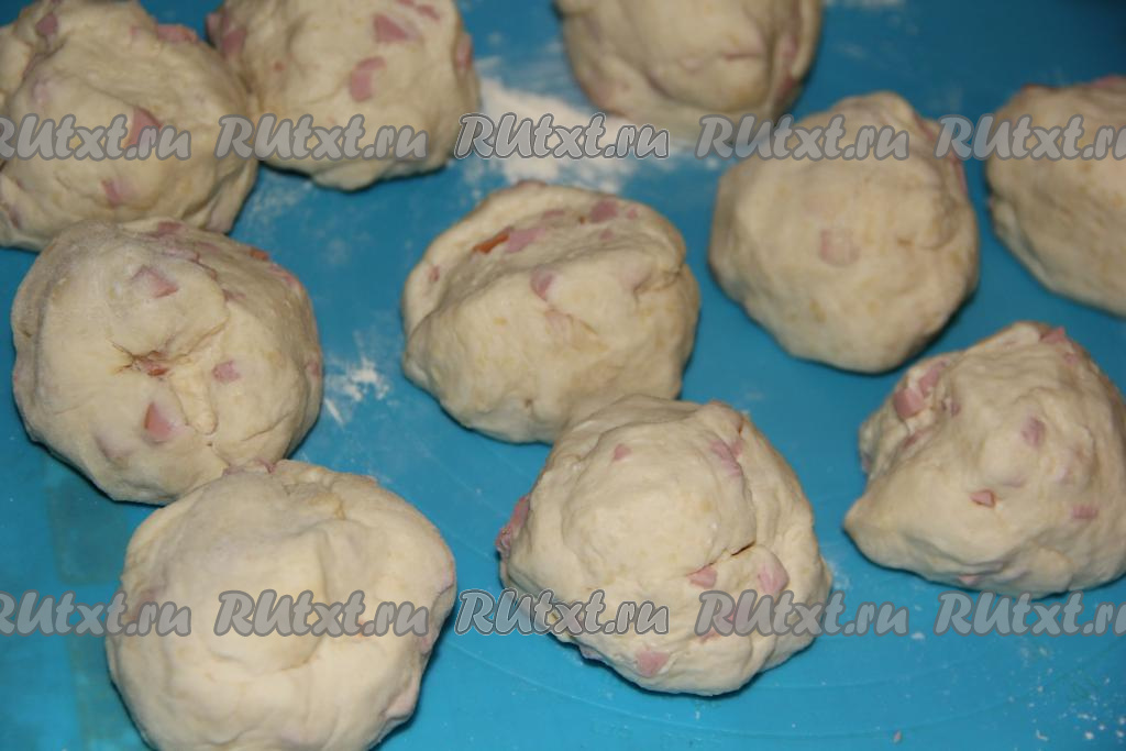 Готовое тесто выложить на стол, припылённый мукой, и разделить тесто на 10-12 частей.