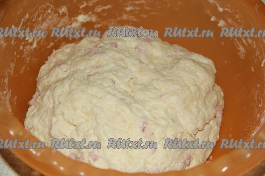 К смеси муки и колбасы добавить сыр, натёртый на мелкой тёрке.
