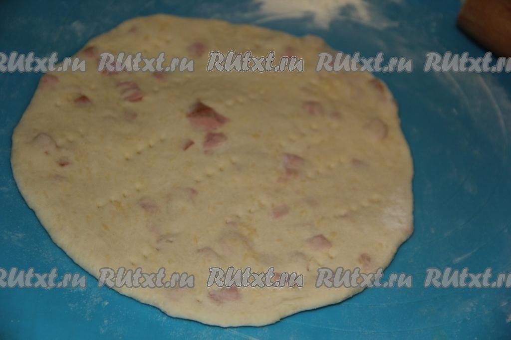 Каждую часть теста раскатать скалкой в круглую лепёшку толщиной, примерно, 0,5 см.
