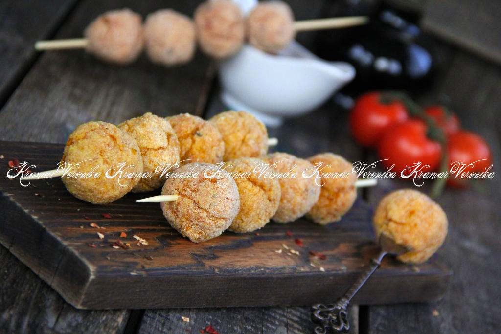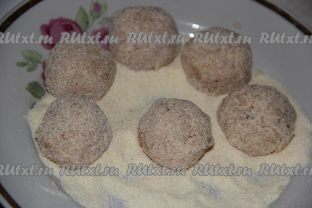 Из получившейся массы сформировать шарики размером с грецкий орех. Я формировала куриные крокеты влажными руками. Обвалять крокеты в манке.