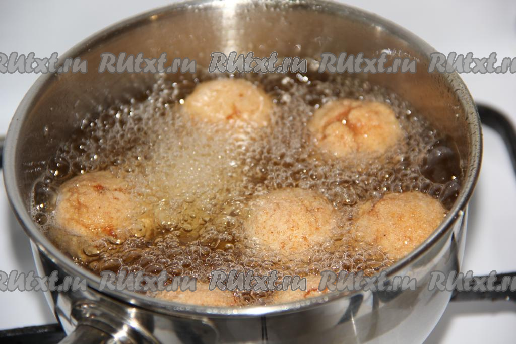 Фритюр хорошо разогреть, масла не жалейте. Аккуратно выложить куриные крокеты во фритюр и жарить до лёгкого золотистого цвета на среднем огне.
