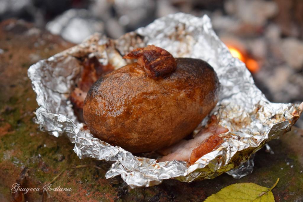 Открытого огня в костре быть не должно, жара от углей будет вполне достаточно. Запекаем картошку 25 минут (время запекания всегда разное и зависит от сорта картофеля и жара углей), периодически переворачивая картофелины.