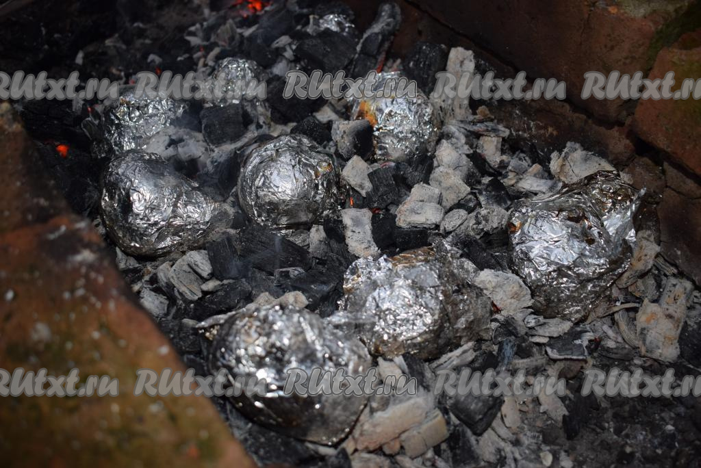 Картошку с салом, завёрнутую в фольгу, выкладываем в костер на угли.