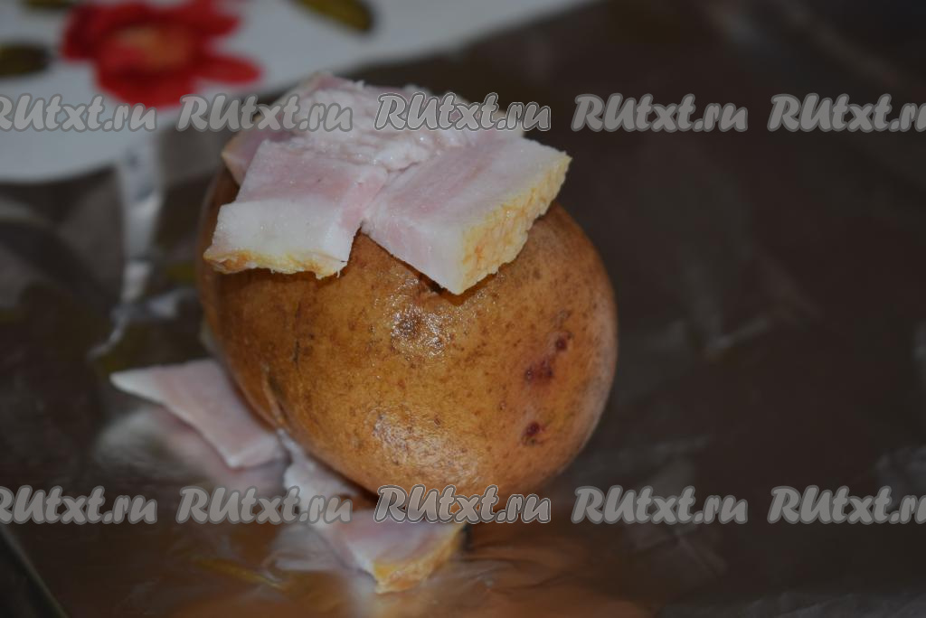 Переворачиваем клубень и на второй крестообразный надрез кладём 2 кусочка сала.