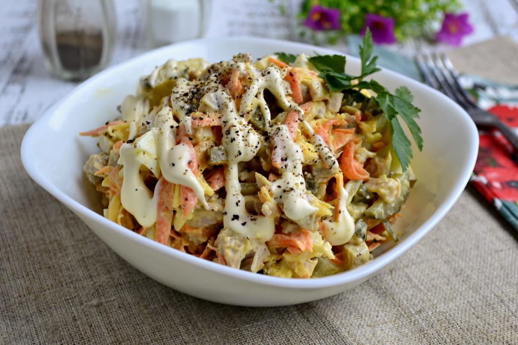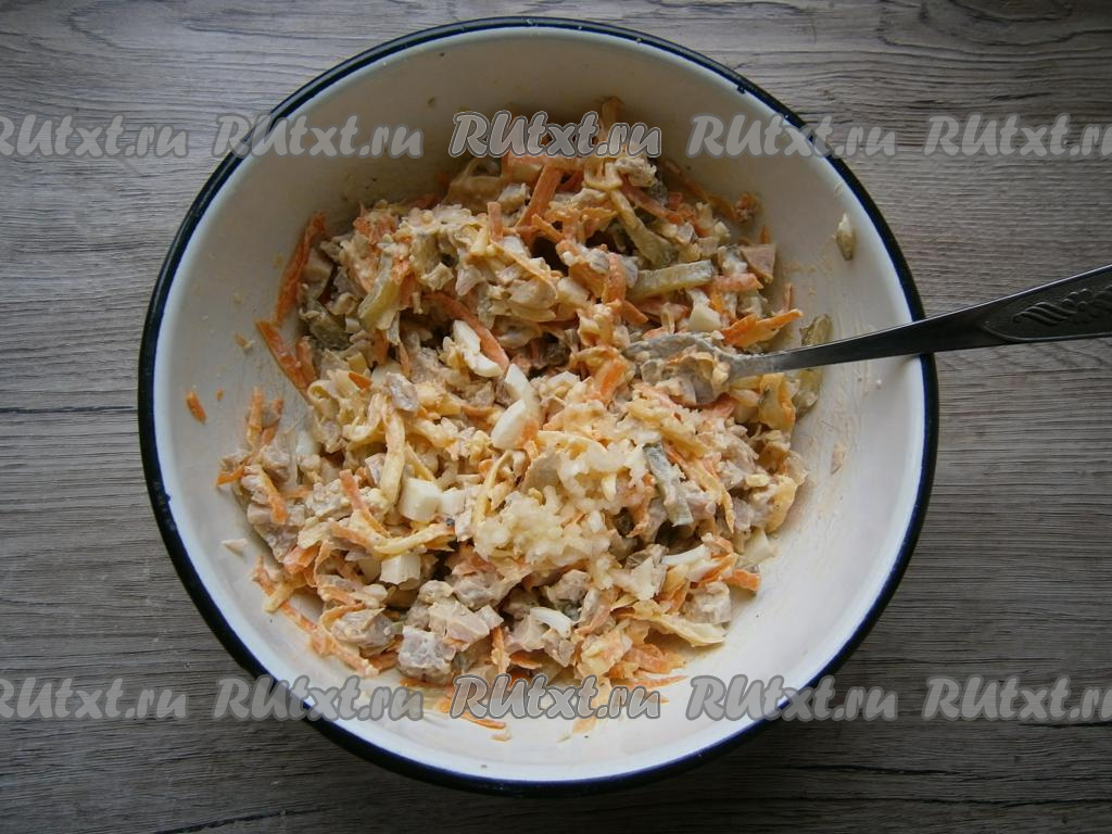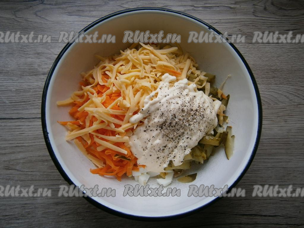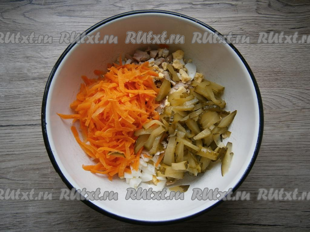 Сюда же добавить очищенную и натертую на крупной терке сырую морковку, нарезанный соломкой или тонкими брусочками маринованный огурец.