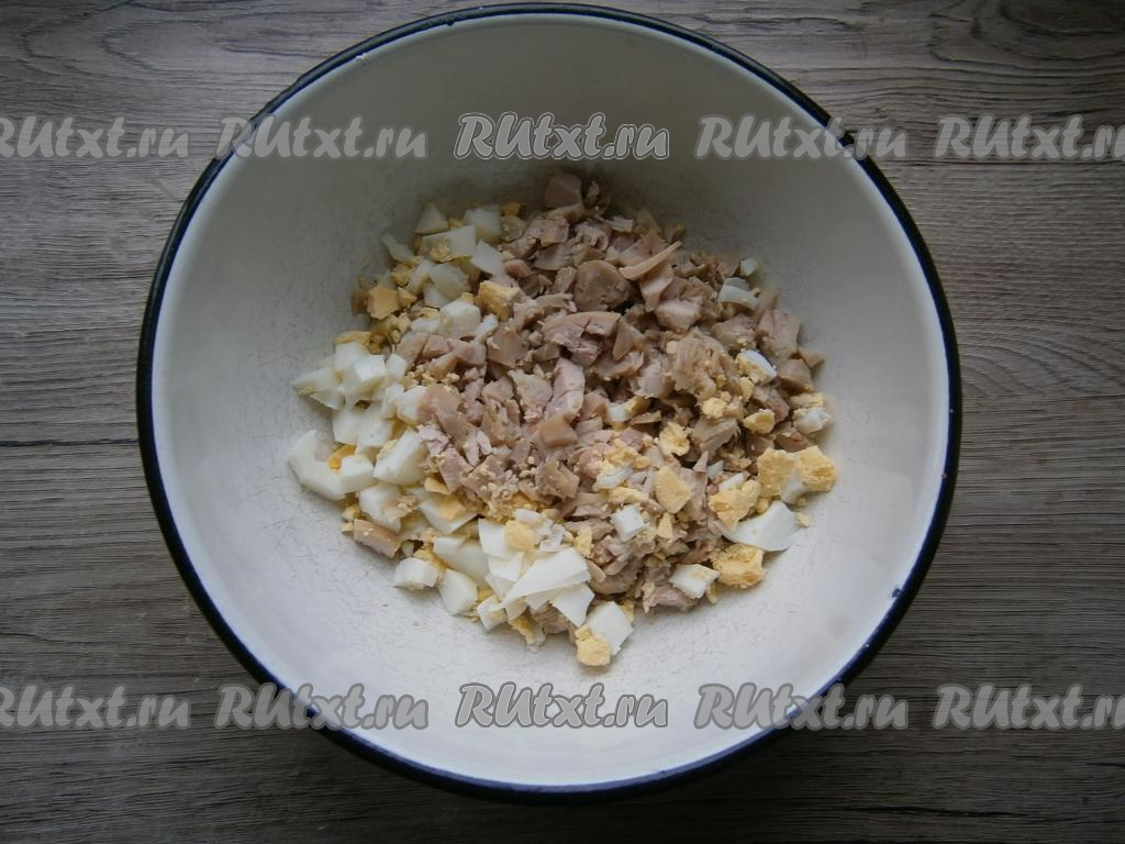 Курицу предварительно отварить и остудить. Я брала обрезь с бедрышек и ножек, варила в подсоленной воде около 30-35 минут. Нарезать куриное мясо маленькими кусочками, добавить очищенные и порубленные вареные яйца.