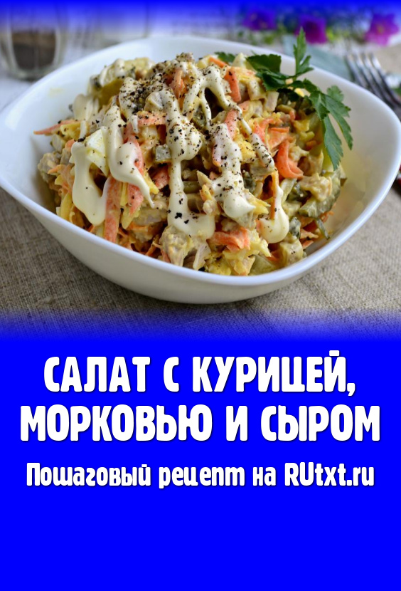 Салат с курицей, морковью и сыром - простой и очень вкусный повседневный салатик, который, наверняка, понравится всей семье. Для этого блюда можно взять любое куриное мясо - грудку, бедрышки, голени и т.д. Вместо майонеза можете добавить сметану, смешанную с небольшим количеством готовой горчицы. Попробуйте, салат получается очень вкусным!
