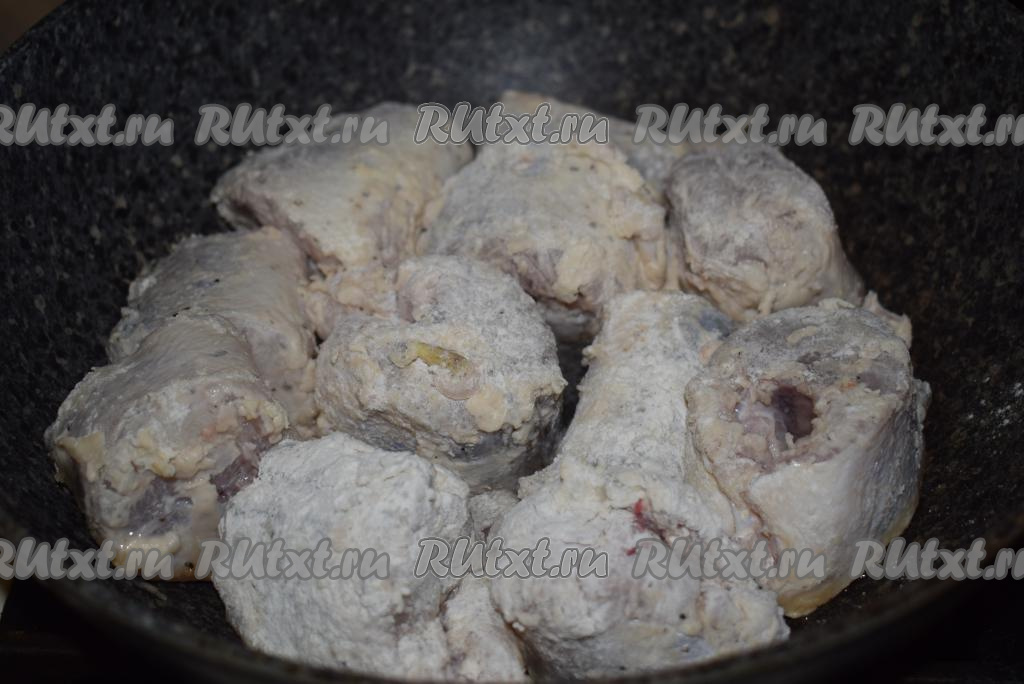 Сковороду разогреваем и добавляем растительное масло. В разогретое масло выкладываем кусочки судака, обваленного в муке, и жарим на среднем огне сначала с одной стороны около 10 минут.