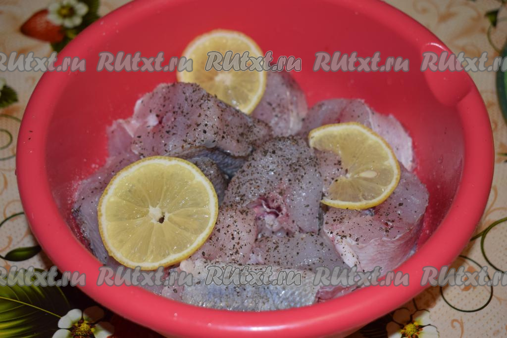 Солим, перчим кусочки судака и выдавливаем на них сок из нескольких долек лимона.