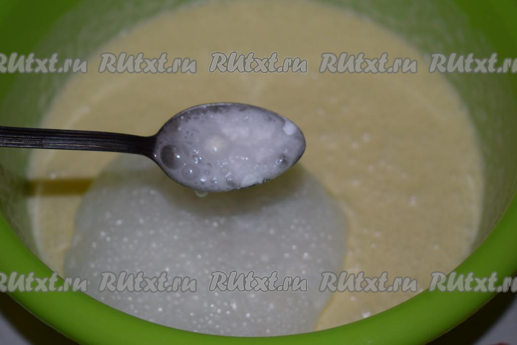 В творожную массу добавим соду, погашенную уксусом.