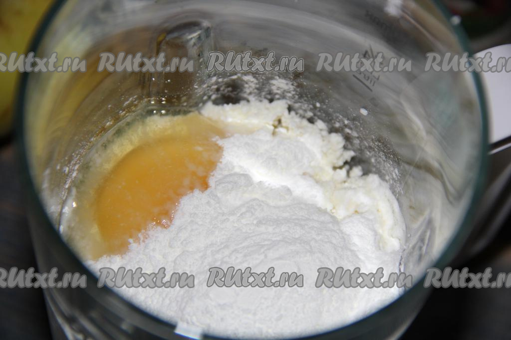 В чашу блендера выложить творог, сахар, крахмал, яйцо и ванильный сахар, влить кефир.