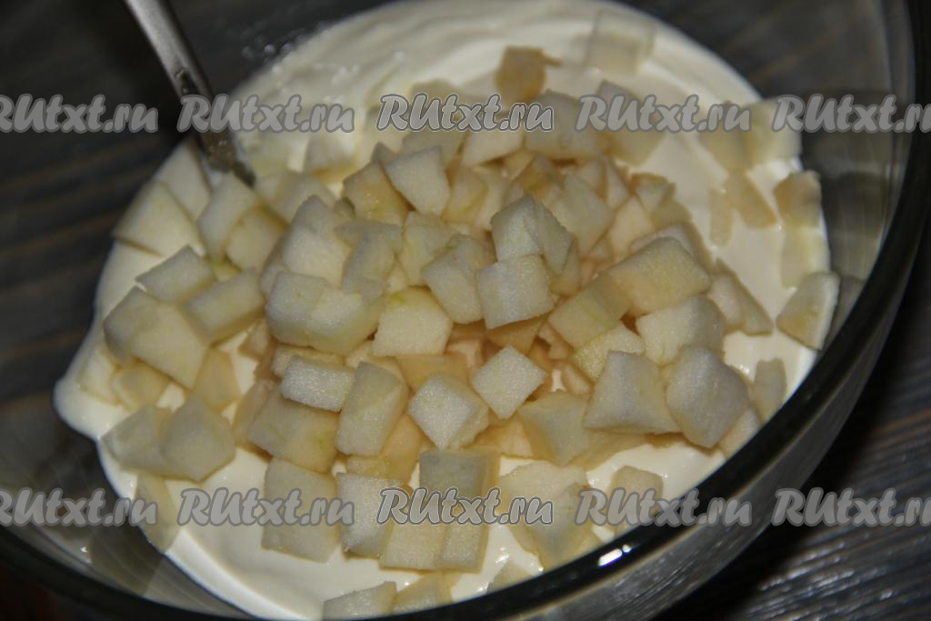 Переложить творожную массу в глубокую миску. Яблоко очистить от кожуры и семечек. Нарезать яблоко на средние кубики. Добавить кусочки яблока в творожную массу.