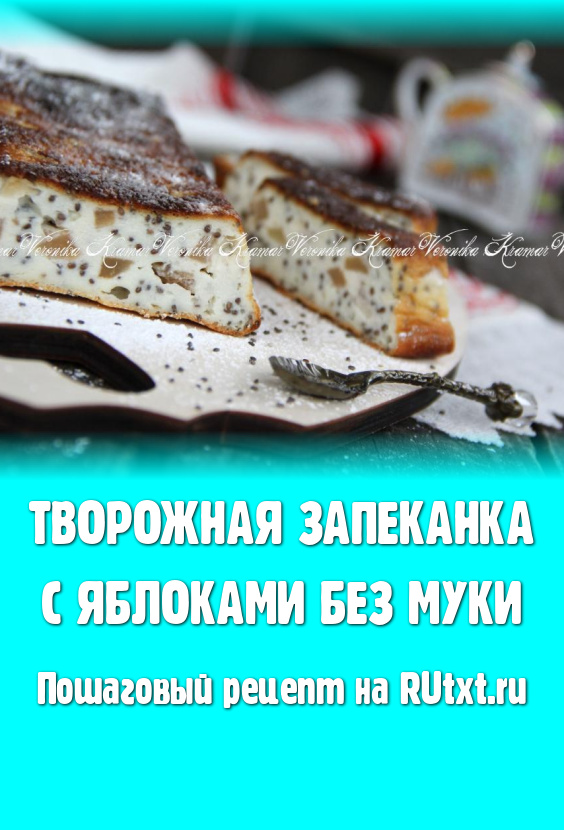 Выпекать творожную запеканку с яблоками в разогретой духовке, примерно, 45 минут при температуре 200 градусов. Готовую запеканку слегка остудить в форме, а затем достать из формы и нарезать на кусочки. Подать вкусную и очень нежную творожную запеканку с яблоком, приготовленную без добавления муки, к столу. По желанию, можно полить сметанкой.