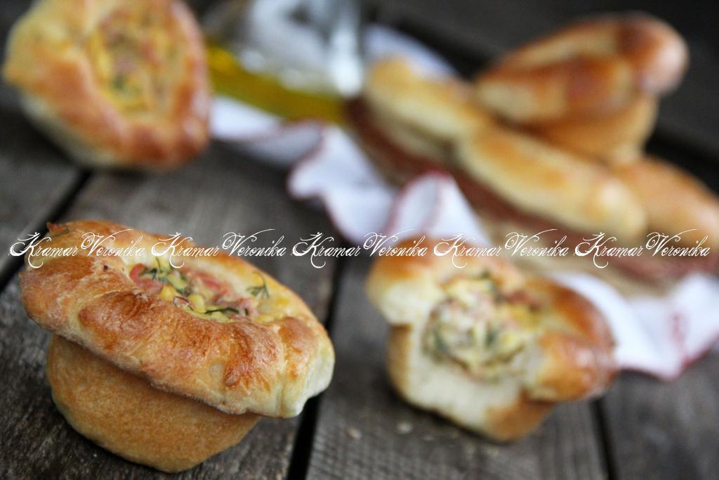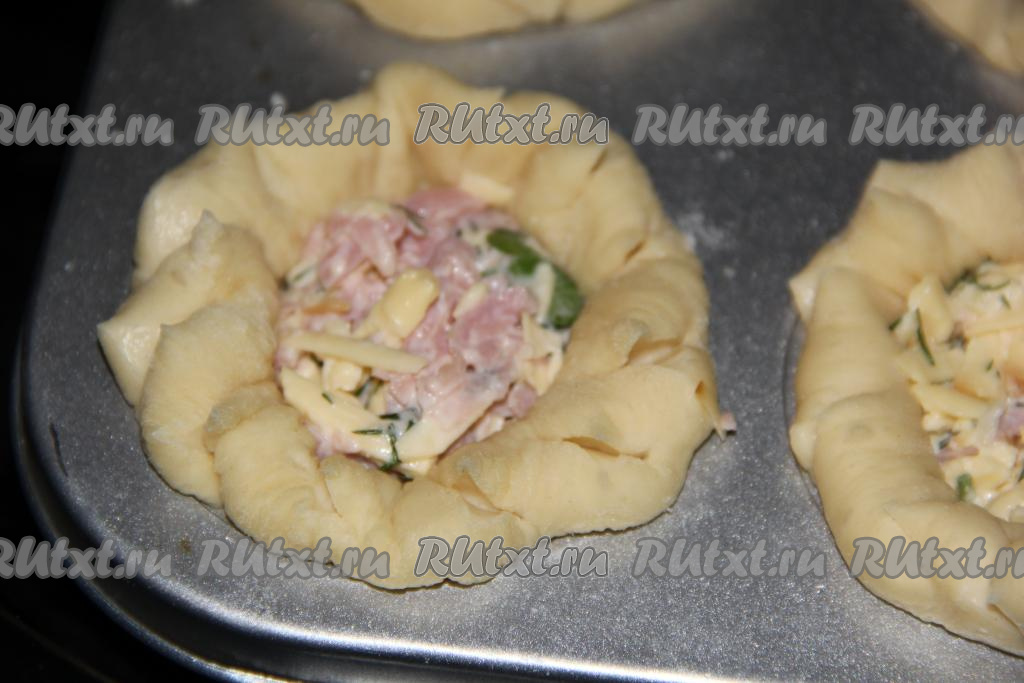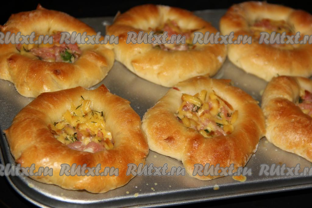 Готовые пирожки легко достаются из формы. Подать к столу лучше в горячем или тёплом виде. Дрожжевое тесто и сытная начинка из сыра и ветчины, наверняка, будут по достоинству оценены мужчинами, да и слабый пол тоже не откажется от сытного пирожка. Вкусная, красивая и по-настоящему домашняя выпечка, попробуйте!