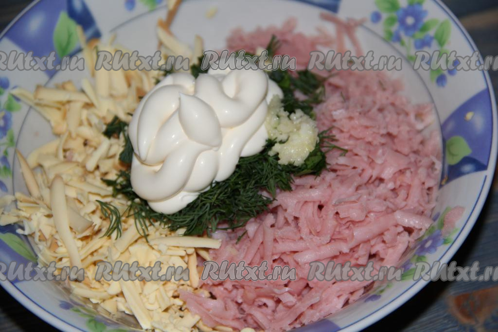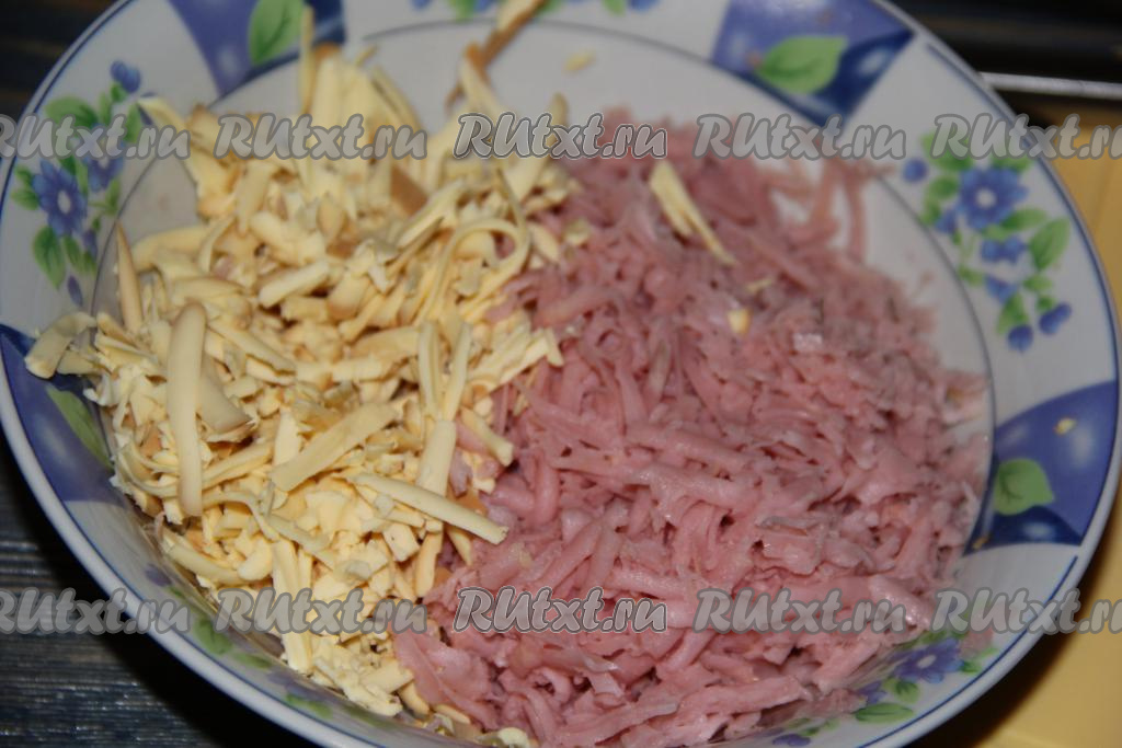 Подготовить начинку: натереть сыр и ветчину на крупной тёрке. Сыр можно взять любой, а ветчину можно заменить вареной колбасой.