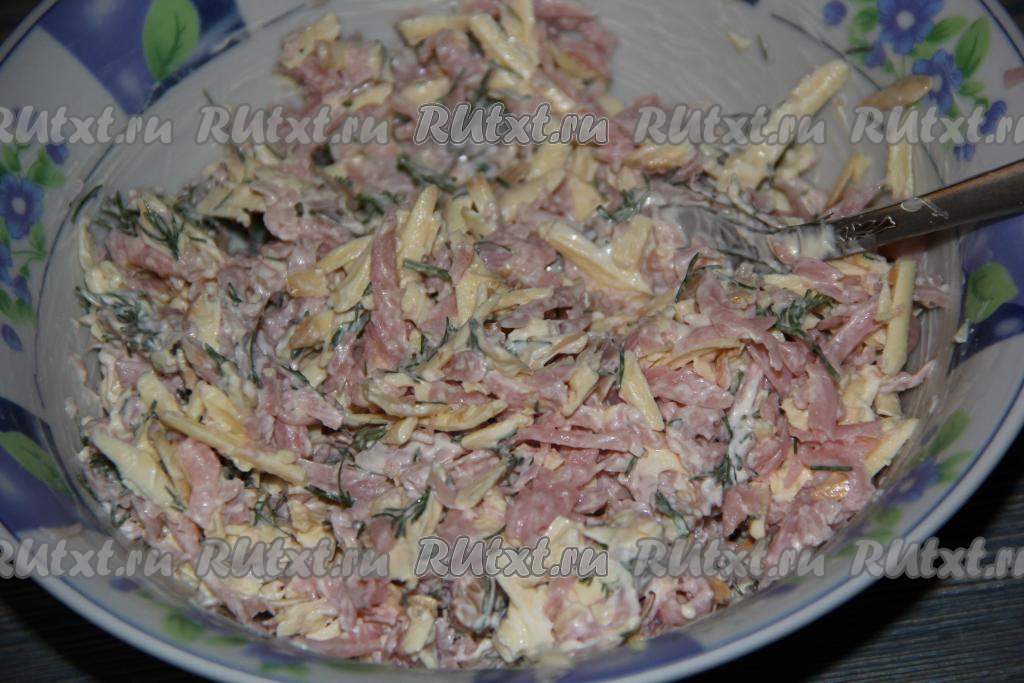 Тщательно перемешать сырно-ветчинную начинку для пирожков.