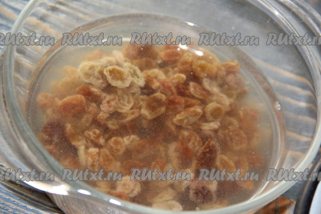 Изюм заранее залить кипятком и оставить на 15-20 минут. Затем откинуть на дуршлаг.