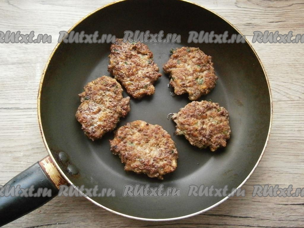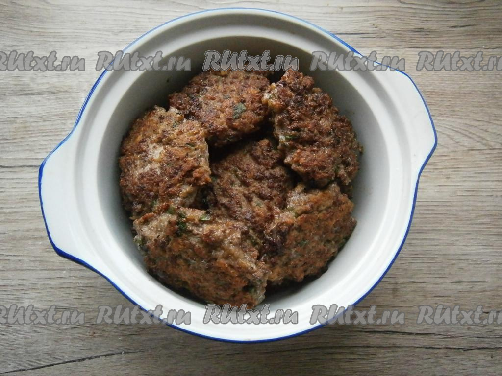 Жареные котлетки сложить в кастрюльку, подходящую для микроволновки, и довести до готовности в течение минут 4 при мощности 700 Ватт или выложить в форму для выпечки и довести их до готовности в духовке, разогретой до 180 градусов, в течение 10-15 минут.