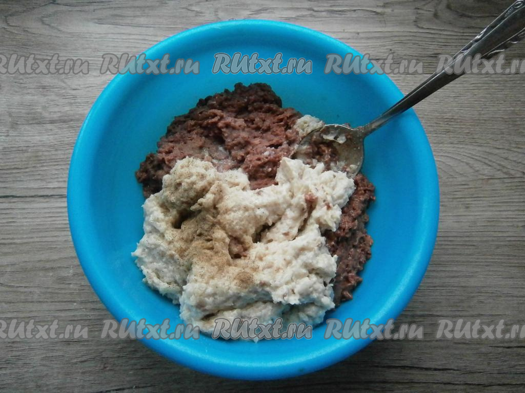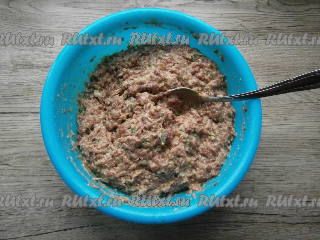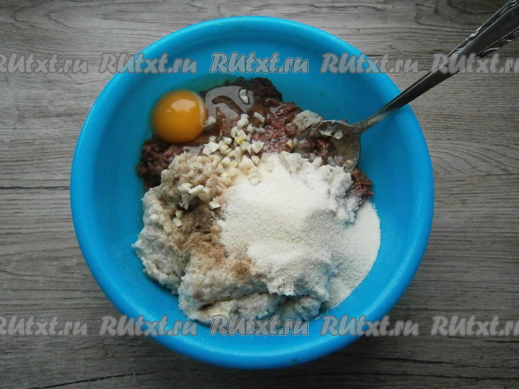 Сюда же добавить яйцо, измельченный чеснок, всыпать манную крупу, тщательно перемешать.