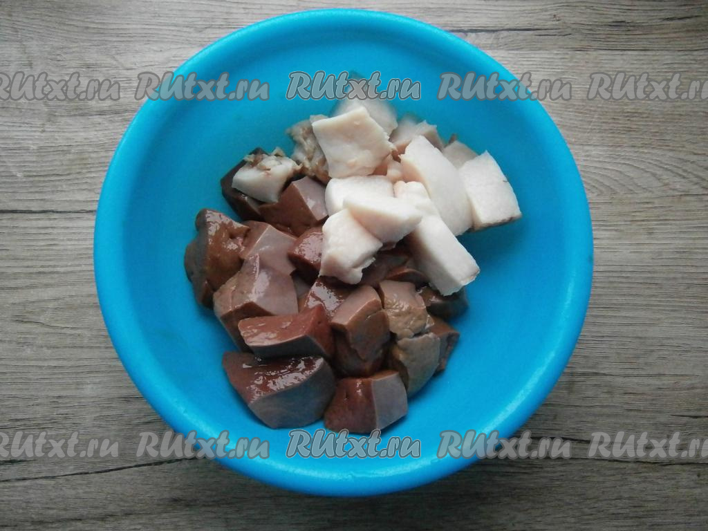 Свиную печень вымыть, полностью залить молоком (или водой) и оставить на 1-2 часа, затем промыть и обсушить. Печень нарезать небольшими кусочками. Свежее сало тоже нарезать на небольшие кусочки.