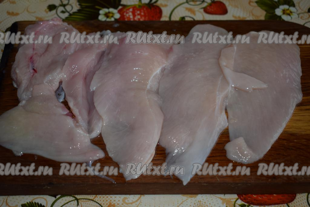 Нарежем куриное филе на пластины толщиной 10-15 мм.