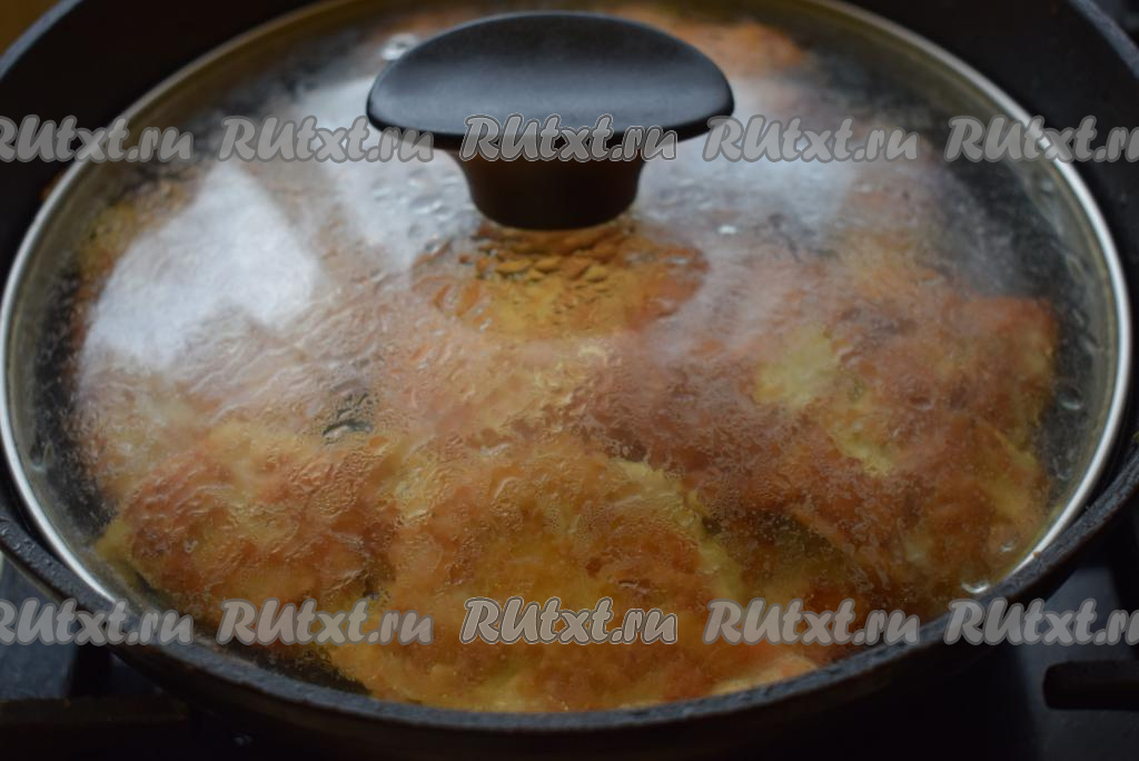 Таким образом обжариваем все отбивные. Далее складываем их в глубокую сковороду, на дно которой наливаем 2-3 столовые ложки воды и, накрыв крышкой, томим на медленном огне, примерно, 8-10 минут.