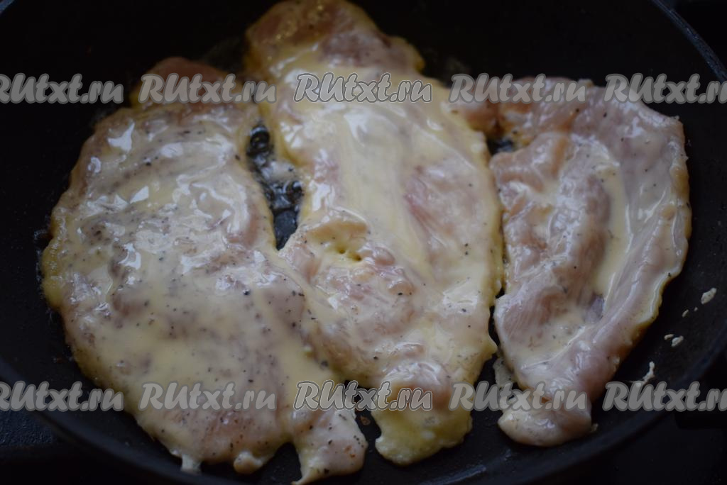 Окунаем наши отбивные в кляр так, чтобы они были покрыты сметанной смесью со всех сторон.