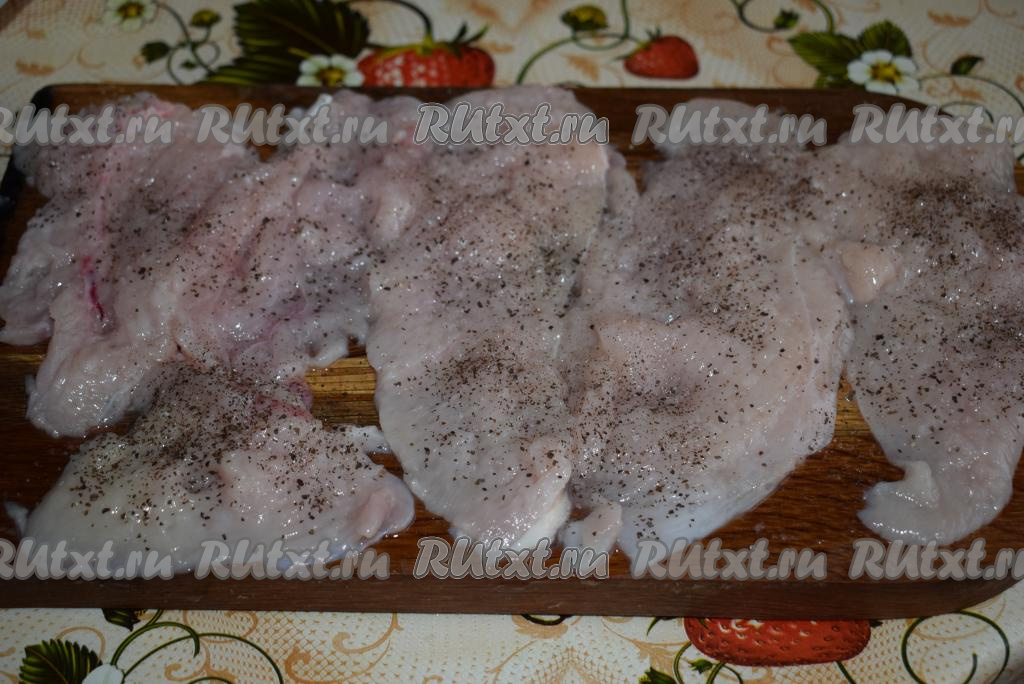 Посолим, поперчим отбивные, добавим, по желанию, специи. Дадим отбивным полежать и пропитаться солью и специями, примерно, 20 минут.