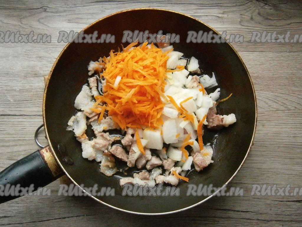 На сковороду с грудинкой (или на сухую сковороду, если готовите без грудинки) влить растительное масло, добавить нарезанный произвольно репчатый лук и натертую на крупной терке морковь.