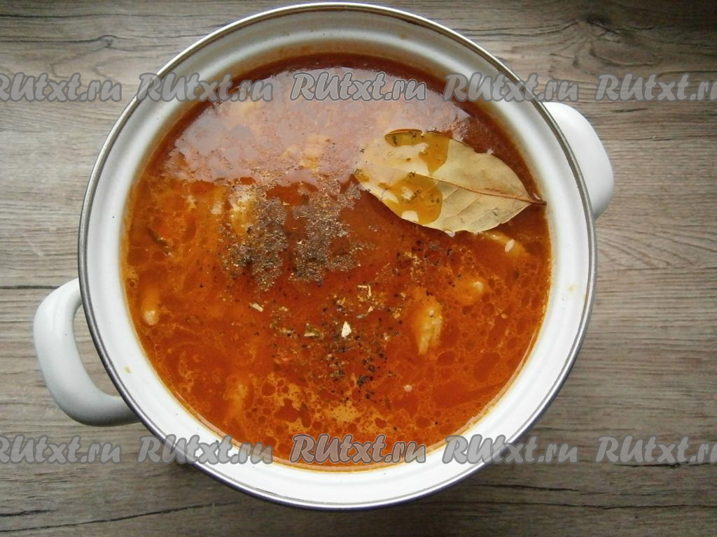 Варить суп на небольшом огне около 10 минут с момента закипания, после этого добавить в содержимое сковороды лавровый лист, всыпать специи. Дать рассольнику закипеть и проварить минут 5 на небольшом огне, выключить газ. Оставить суп под крышкой на 10 минут.