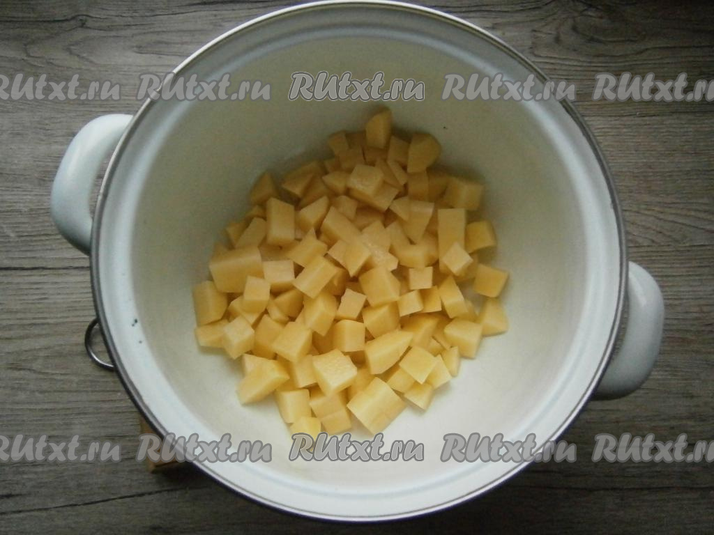 Картофель очистить и нарезать в кастрюлю небольшими кубиками.