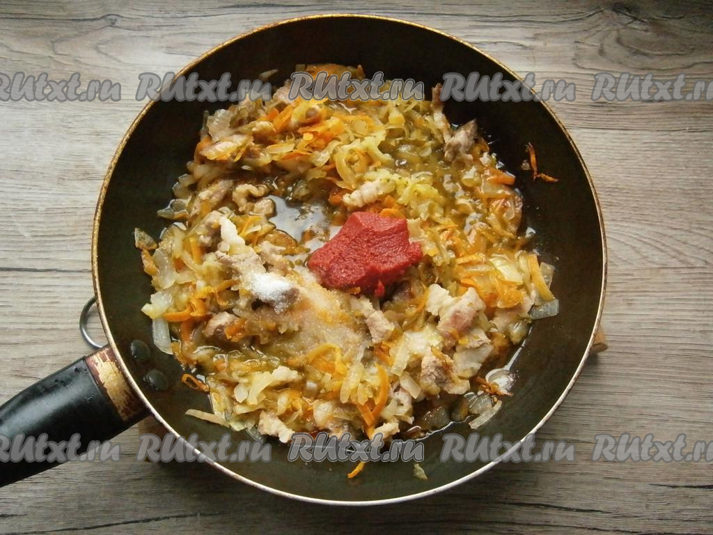 Также добавить в сковороду томатную пасту, сахар и влить рассол.