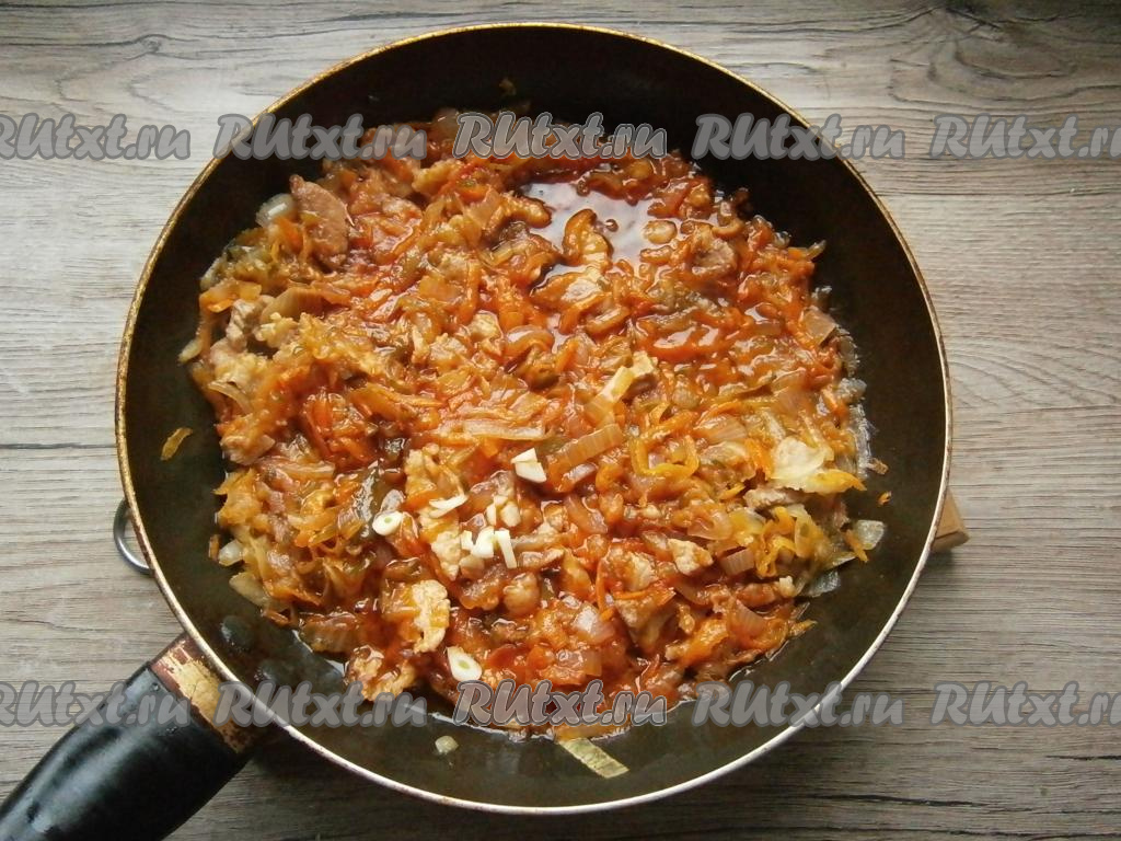 Все перемешать и протушить на небольшом огне минут 10. В конце добавить измельченный чеснок.