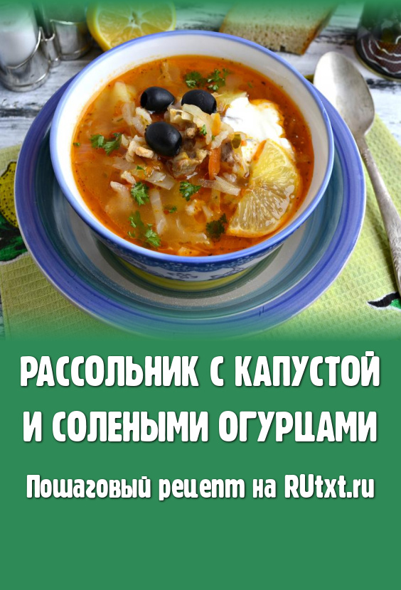 Вкусный, насыщенный, сытный рассольник, приготовленный с капустой и солеными огурцами, разлить по тарелкам, добавить сметану, дополнить оливками, лимоном и зеленью, подать к столу.