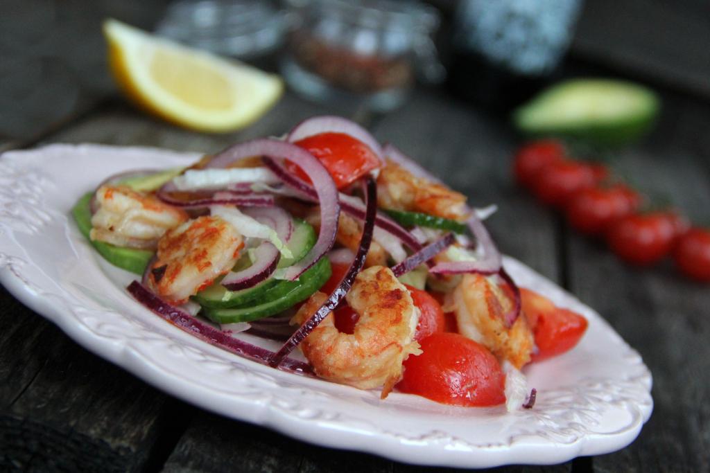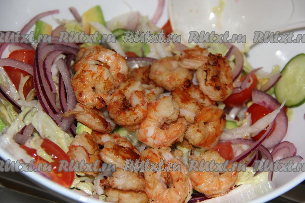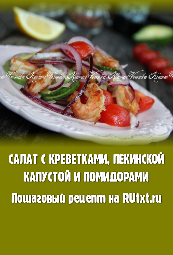 Яркий, легкий, вкусный салат с креветками, пекинской капустой и помидорами сразу подать к столу.
