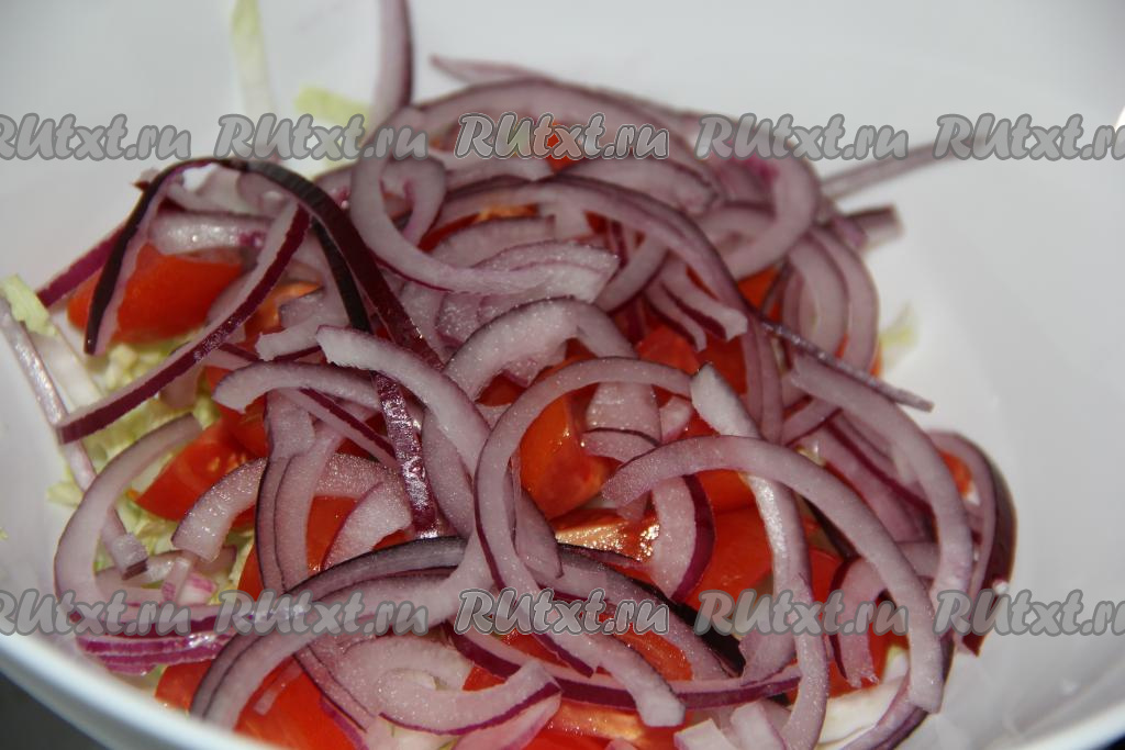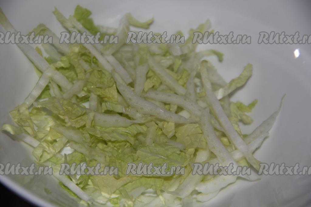 В глубокий салатник выложить нашинкованную пекинскую капусту.
