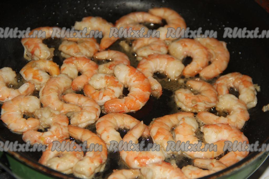 Затем обжарить креветки на сухой сковороде с двух сторон до золотистого цвета. Креветки жарятся на среднем огне достаточно быстро, примерно, по 2 минуты с каждой стороны. По желанию, можно креветки не мариновать и не обжаривать, а просто отварить.