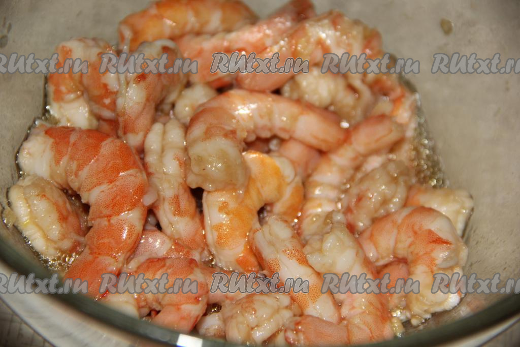 Креветки разморозить при комнатной температуре, затем очистить от голов и панцирей. Промыть креветки в холодной воде. Креветки замариновать в лимонном соке, пропущенном через пресс чесноке и масле. Оставить креветки в маринаде на 30 минут.