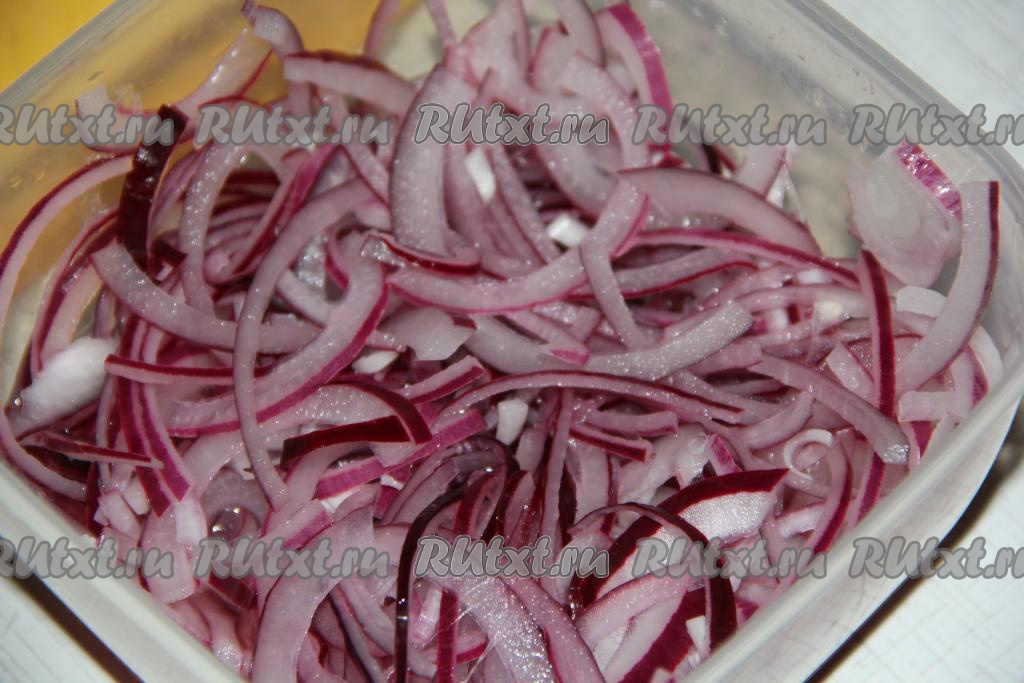 Замариновать лук в уксусе с сахаром и водой и оставить на 15 минут.