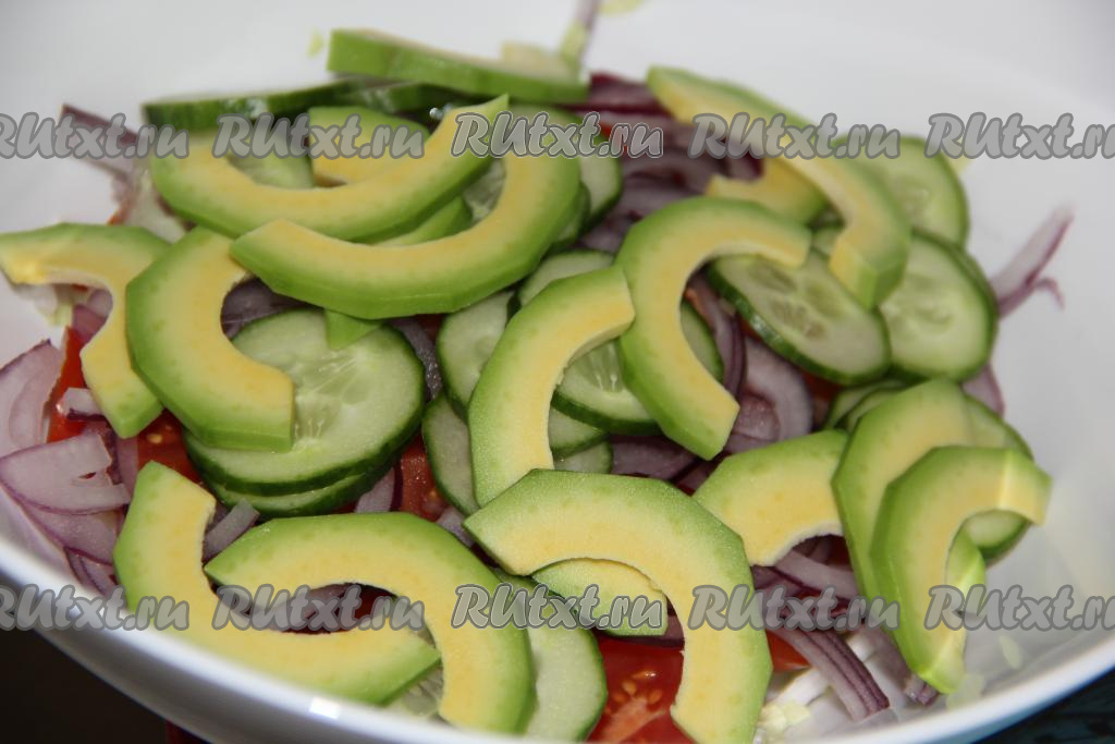 Авокадо очистить, нарезать тонкими полукольцами и тоже добавить в салат.