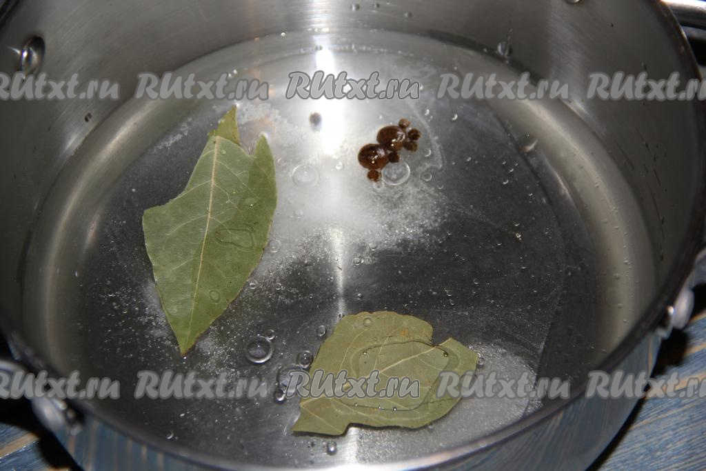 Теперь приготовим маринад для вешенок, для этого в кастрюлю нужно влить 200 мл воды, всыпать 2 чайные ложки соли и 1 чайную ложку сахара, 50 мл растительного масла, 5 лавровых листочков, 5 горошин черного перца и 2 горошины душистого перца.