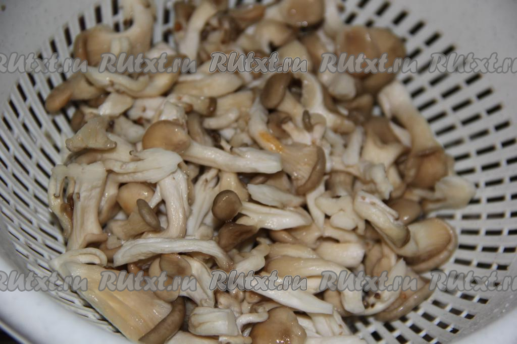 Срезать с ножек вешенок землю. Разобрать грибы так, чтобы они были отделены друг от друга. Промыть грибочки под проточной водой. Я выкладываю вешенки в дуршлаг и промываю их под водой.