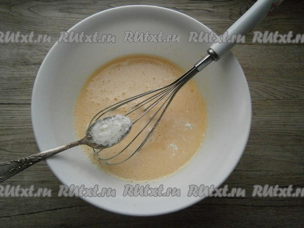 Перемешать получившуюся массу венчиком, всыпать гашеную лимонным соком соду.