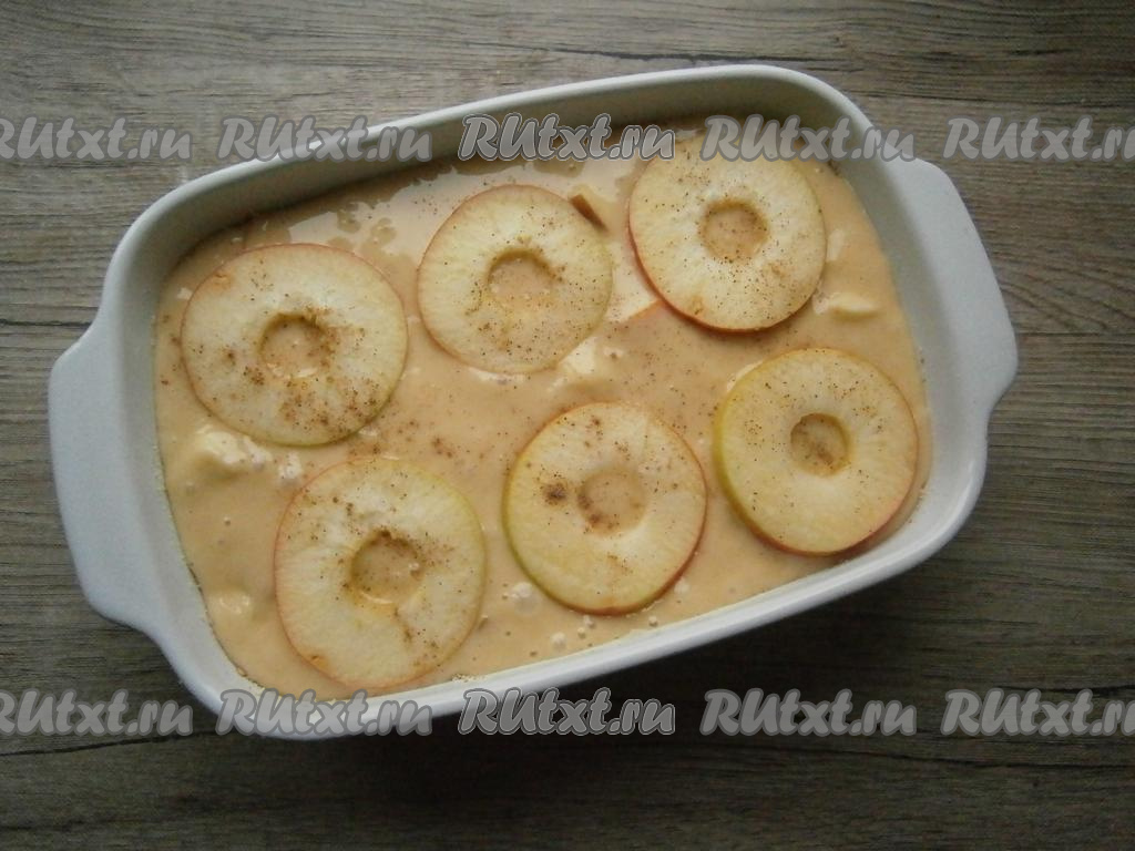 Тесто с яблоками хорошо перемешать и выложить его в форму. Из оставшегося яблока удалить сердцевину специальным ножом, чтобы яблоко осталось целым. Нарезать яблоко кружками и разложить их сверху на тесто. Посыпать корицей.