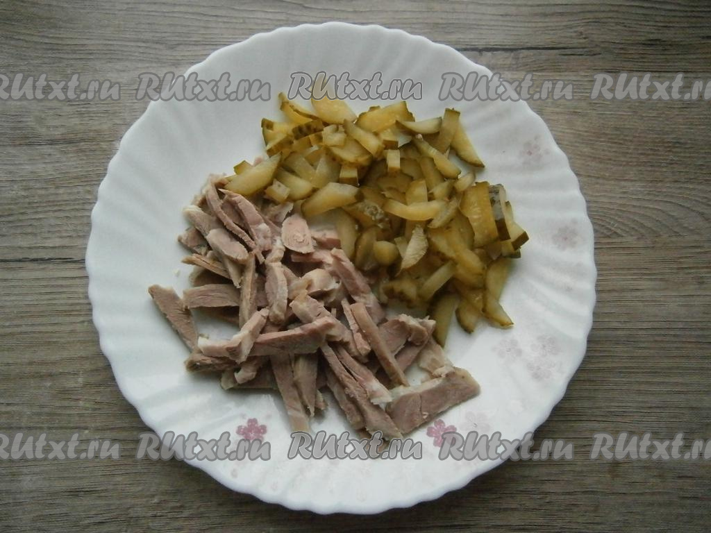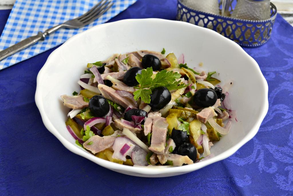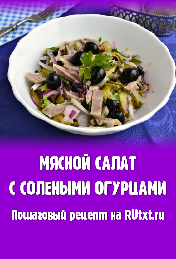 Мясной салат, приготовленный с солеными огурцами, - простое и очень вкусное блюдо для семейного ужина. Я использовала в салате отварную свинину, можете взять говядину, телятину, баранину, а также мясо утки, гуся и т.д. Для того чтобы сделать вкус блюда более изысканным, я добавила черные оливки, если вам нравятся зеленые - можете использовать их, или вовсе не добавлять. Лук я взяла двух сортов - синий и обычный репчатый, можете добавлять один из них. Приготовьте этот простой, вкусный, интересный салат и вы точно останетесь довольны!
